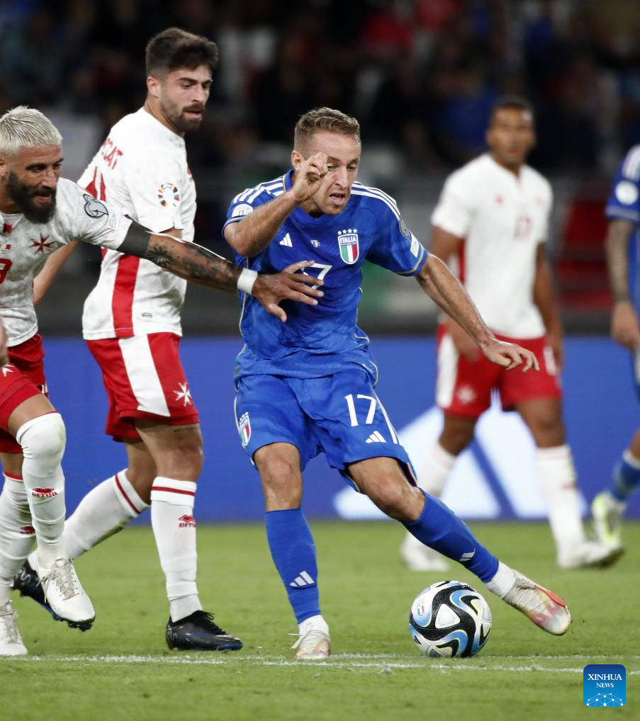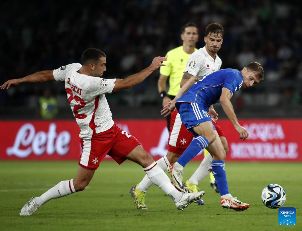 Italy's Nicolo Barella (R) vies with Malta's Bjorn Kristensen during the UEFA EURO 2024 Group C qualifying round match between Italy and Malta in Bari, Italy, Oct. 14, 2023. (Photo by Augusto Casasoli/Xinhua)