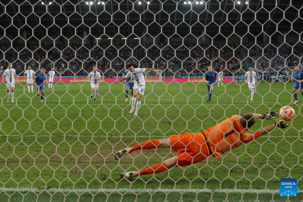 Benjamin Sesko (R) of Slovenia shoots to second score during the UEFA EURO 2024 Group H qualifying round football match between Slovenia and Finland in Ljubljana, Slovenia, on Oct. 14, 2023. (Photo by Zeljko Stevanic/Xinhua)