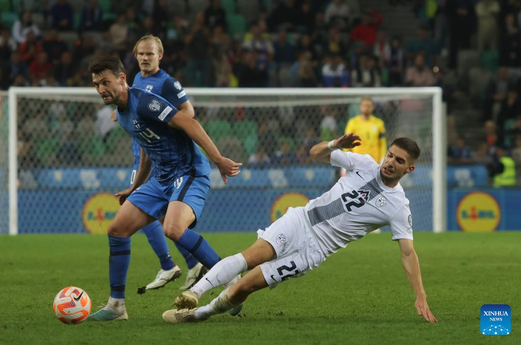 Adam Cerin (R) of Slovenia vies with Kaan Kairinen (L) of Finland during the UEFA EURO 2024 Group H qualifying round football match between Slovenia and Finland in Ljubljana, Slovenia, on Oct. 14, 2023. (Photo by Zeljko Stevanic/Xinhua)