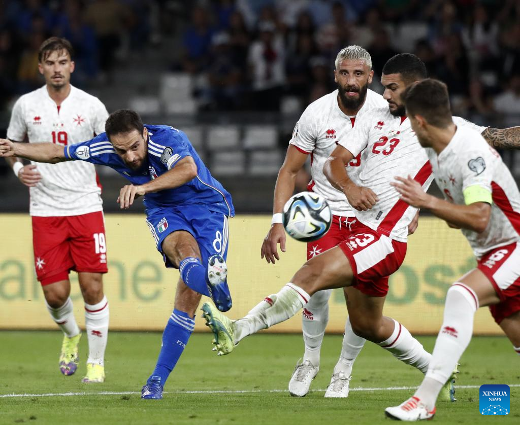 Italy's Davide Frattesi shoots to score during the UEFA EURO 2024 Group C qualifying round match between Italy and Malta in Bari, Italy, Oct. 14, 2023. (Photo by Augusto Casasoli/Xinhua)