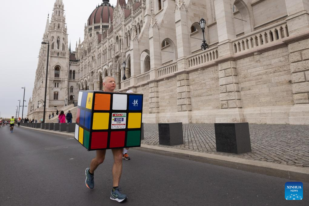 A man in a Rubick's cube costume participates in the Budapest Marathon in downtown Budapest, Hungary on Oct. 15, 2023. (Photo by Attila Volgyi/Xinhua)