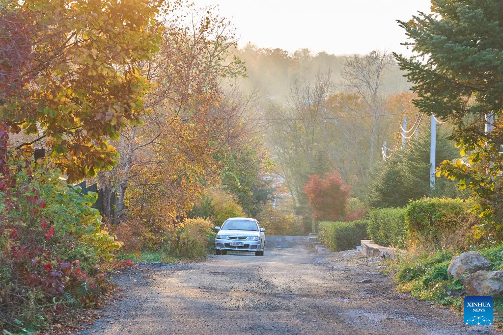 This photo taken on Oct. 15, 2023 shows a car parking on a forest path in Vladivostok, Russia. (Photo by Guo Feizhou/Xinhua)