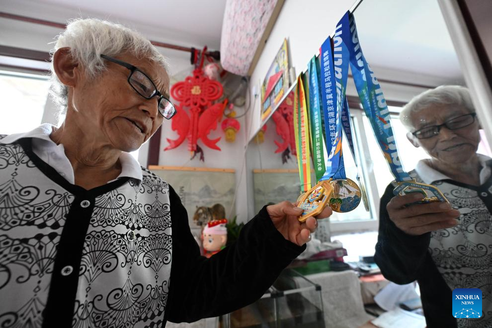 Liu Runlong displays his marathon medal at home in north China's Tianjin, Oct. 14, 2023. Liu Runlong, 72, is a marathon enthusiast. He participated in the first marathon held in Tianjin in 1981. Liu lost his right hand in an accident at work in 1996. The physical disability did not stop him from running. Liu attended many marathon competitions in Beijing, Dalian, Xiamen and other cities in China. Every morning at four o'clock, Liu began to run along the Haihe River. "I'll run as long as I can. Marathon is not just for young men." he said. (Xinhua/Zhao Zishuo)