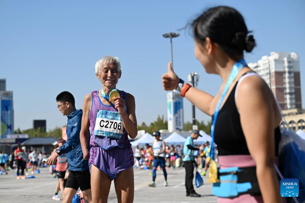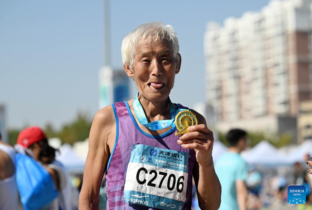 Liu Runlong displays his medal after the 2023 Tianjin Marathon, in north China's Tianjin, on Oct. 15, 2023. Liu Runlong, 72, is a marathon enthusiast. He participated in the first marathon held in Tianjin in 1981. Liu lost his right hand in an accident at work in 1996. The physical disability did not stop him from running. Liu attended many marathon competitions in Beijing, Dalian, Xiamen and other cities in China. Every morning at four o'clock, Liu began to run along the Haihe River. "I'll run as long as I can. Marathon is not just for young men." he said. (Xinhua/Zhao Zishuo)