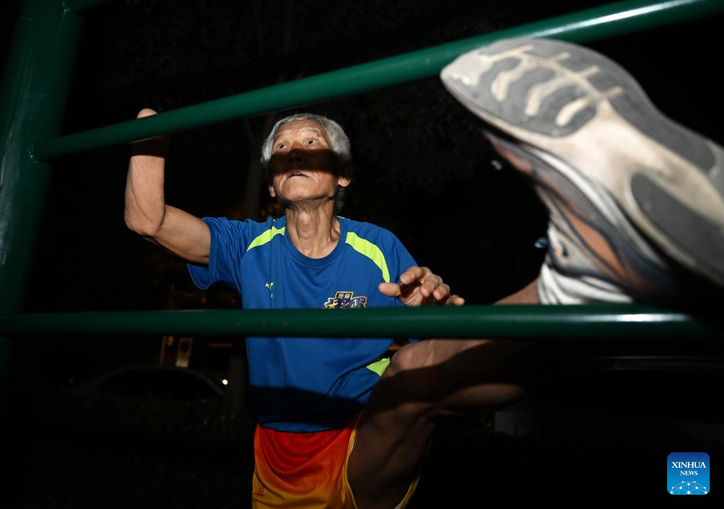 Liu Runlong stretches to warm up at a park in north China's Tianjin, in the early morning on Oct. 12, 2023. Liu Runlong, 72, is a marathon enthusiast. He participated in the first marathon held in Tianjin in 1981. Liu lost his right hand in an accident at work in 1996. The physical disability did not stop him from running. Liu attended many marathon competitions in Beijing, Dalian, Xiamen and other cities in China. Every morning at four o'clock, Liu began to run along the Haihe River. "I'll run as long as I can. Marathon is not just for young men." he said. (Xinhua/Zhao Zishuo)