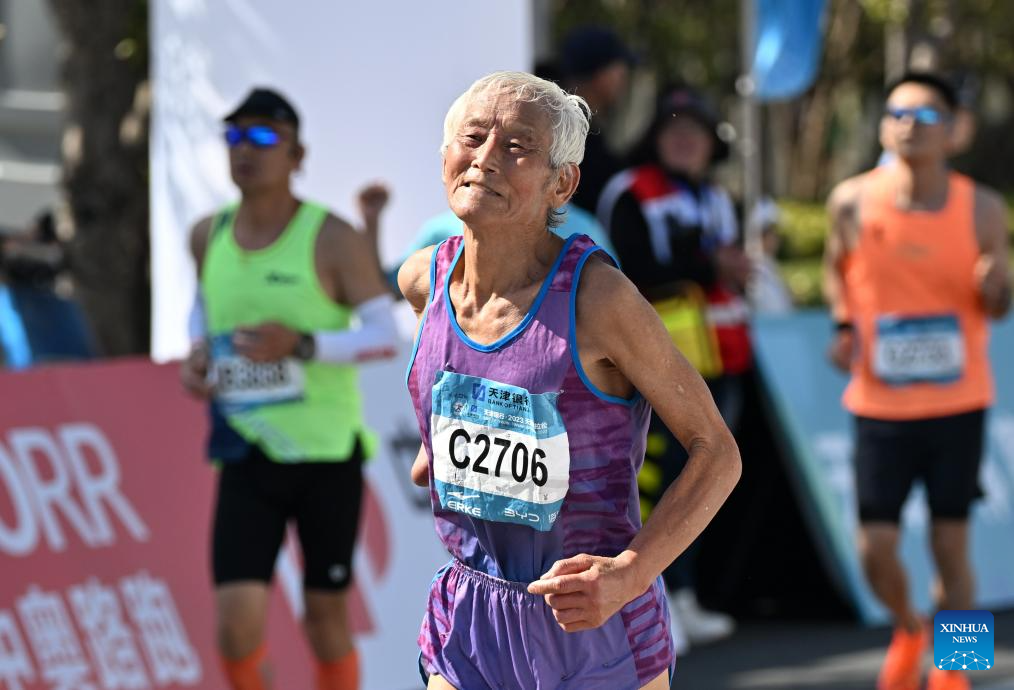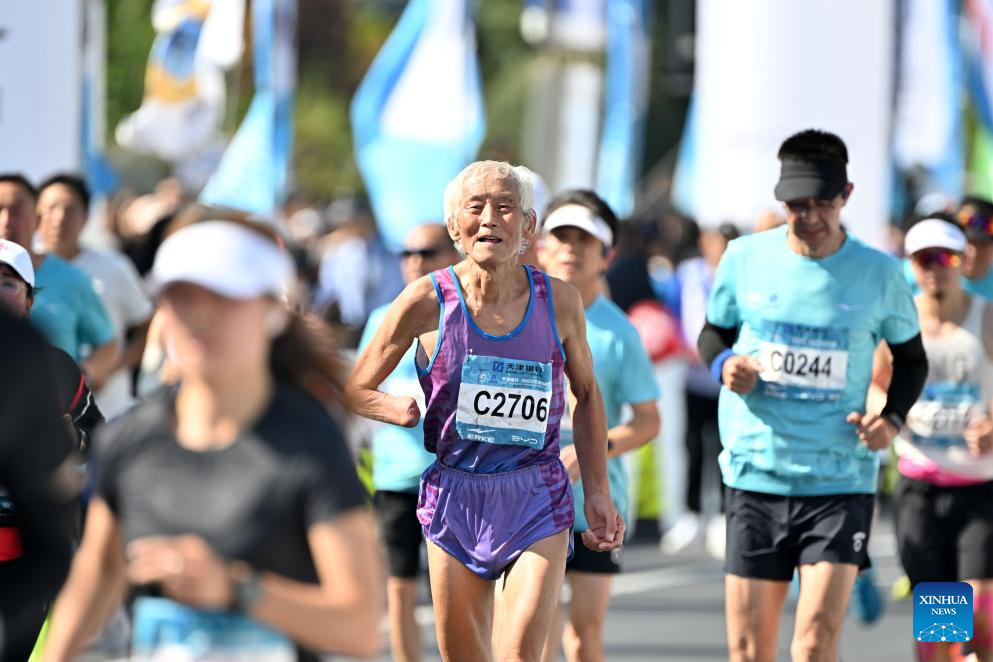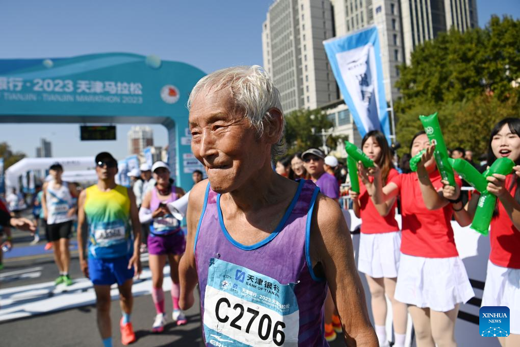 Liu Runlong (C) runs during the 2023 Tianjin Marathon in north China's Tianjin, on Oct. 15, 2023. Liu Runlong, 72, is a marathon enthusiast. He participated in the first marathon held in Tianjin in 1981. Liu lost his right hand in an accident at work in 1996. The physical disability did not stop him from running. Liu attended many marathon competitions in Beijing, Dalian, Xiamen and other cities in China. Every morning at four o'clock, Liu began to run along the Haihe River. "I'll run as long as I can. Marathon is not just for young men." he said. (Xinhua/Li Ran)