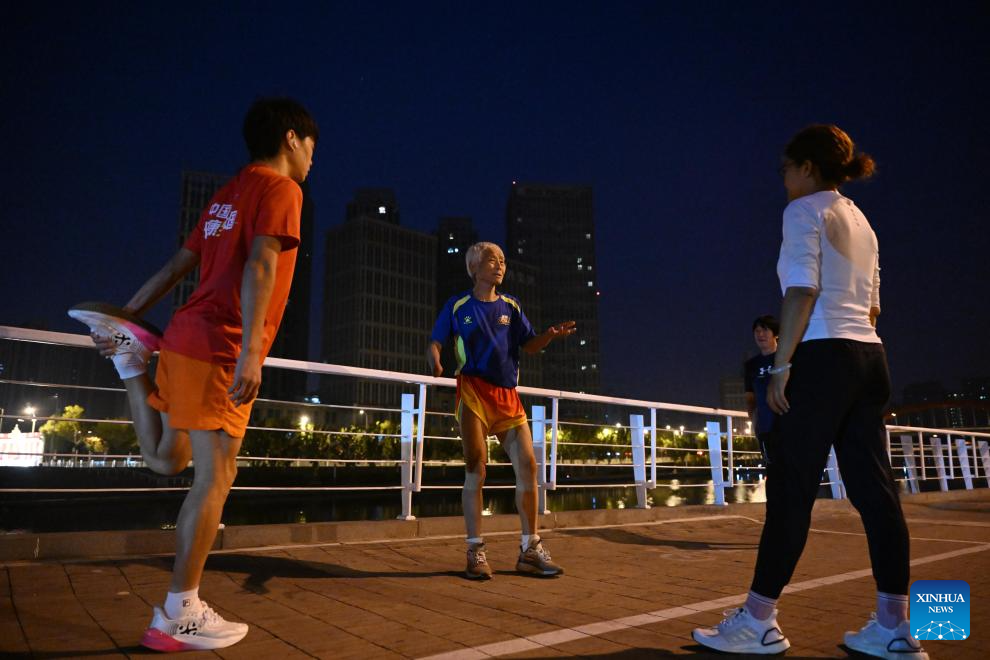 Liu Runlong talks with friends in north China's Tianjin, in the early morning on Oct. 12, 2023. Liu Runlong, 72, is a marathon enthusiast. He participated in the first marathon held in Tianjin in 1981. Liu lost his right hand in an accident at work in 1996. The physical disability did not stop him from running. Liu attended many marathon competitions in Beijing, Dalian, Xiamen and other cities in China. Every morning at four o'clock, Liu began to run along the Haihe River. "I'll run as long as I can. Marathon is not just for young men." he said. (Xinhua/Zhao Zishuo)