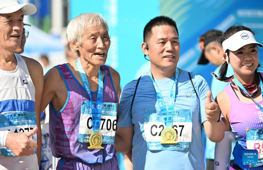 Liu Runlong (L) displays his medal after the 2023 Tianjin Marathon, in north China's Tianjin, on Oct. 15, 2023. Liu Runlong, 72, is a marathon enthusiast. He participated in the first marathon held in Tianjin in 1981. Liu lost his right hand in an accident at work in 1996. The physical disability did not stop him from running. Liu attended many marathon competitions in Beijing, Dalian, Xiamen and other cities in China. Every morning at four o'clock, Liu began to run along the Haihe River. "I'll run as long as I can. Marathon is not just for young men." he said. (Xinhua/Zhao Zishuo)