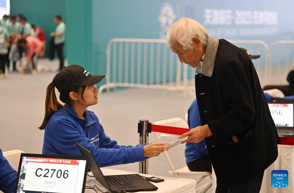 Liu Runlong (L) receives the supplies of the 2023 Tianjin Marathon, at Meijiang Convention and Exhibition Center in north China's Tianjin, on Oct. 12, 2023. Liu Runlong, 72, is a marathon enthusiast. He participated in the first marathon held in Tianjin in 1981. Liu lost his right hand in an accident at work in 1996. The physical disability did not stop him from running. Liu attended many marathon competitions in Beijing, Dalian, Xiamen and other cities in China. Every morning at four o'clock, Liu began to run along the Haihe River. "I'll run as long as I can. Marathon is not just for young men." he said. (Xinhua/Li Ran)