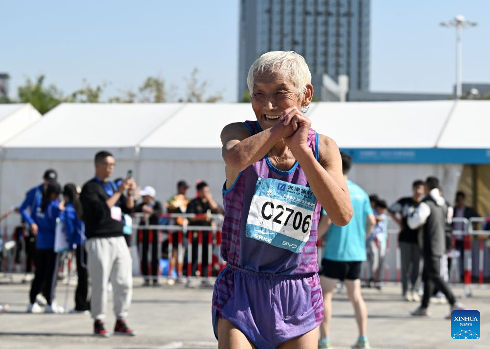 Liu Runlong greets other runners after the 2023 Tianjin Marathon in north China's Tianjin, on Oct. 15, 2023. Liu Runlong, 72, is a marathon enthusiast. He participated in the first marathon held in Tianjin in 1981. Liu lost his right hand in an accident at work in 1996. The physical disability did not stop him from running. Liu attended many marathon competitions in Beijing, Dalian, Xiamen and other cities in China. Every morning at four o'clock, Liu began to run along the Haihe River. "I'll run as long as I can. Marathon is not just for young men." he said. (Xinhua/Zhao Zishuo)
