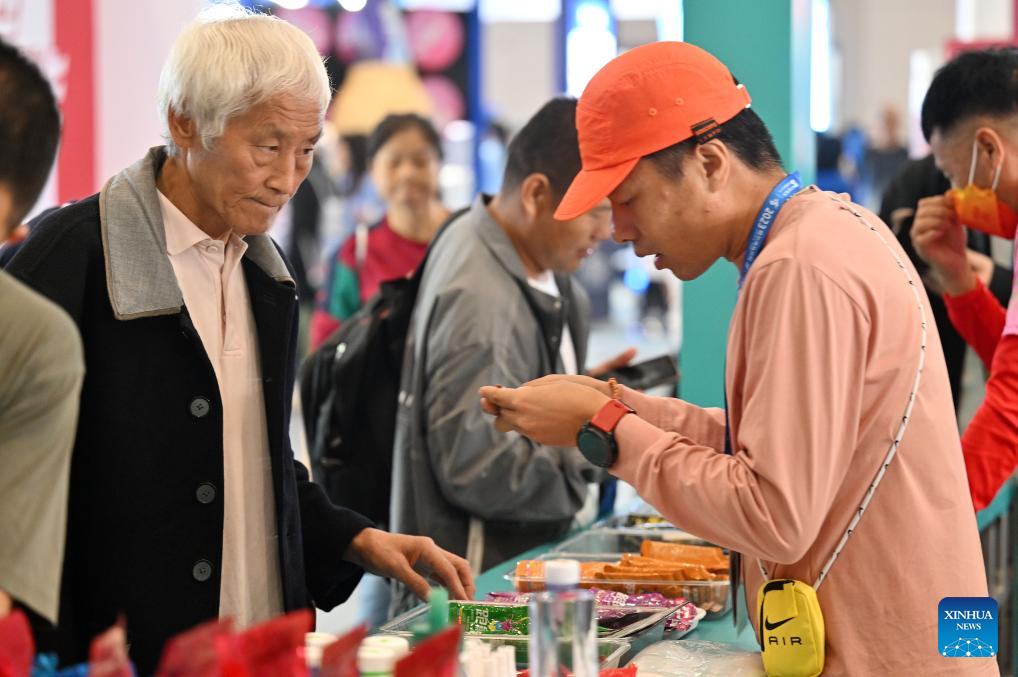 Liu Runlong (L) buys sports supplements for the 2023 Tianjin Marathon in north China's Tianjin, on Oct. 12, 2023. Liu Runlong, 72, is a marathon enthusiast. He participated in the first marathon held in Tianjin in 1981. Liu lost his right hand in an accident at work in 1996. The physical disability did not stop him from running. Liu attended many marathon competitions in Beijing, Dalian, Xiamen and other cities in China. Every morning at four o'clock, Liu began to run along the Haihe River. "I'll run as long as I can. Marathon is not just for young men." he said. (Xinhua/Li Ran)