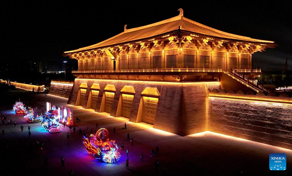 This aerial photo taken on Sept. 30, 2023 shows parade floats past the Daming Palace National Heritage Park in Xi'an, northwest China's Shaanxi Province. About 2,000 years ago, in the Western Han Dynasty (202 B.C.- A.D. 25), a Chinese envoy named Zhang Qian began his expedition to the Western Regions and opened a trade route that later became the Silk Road.