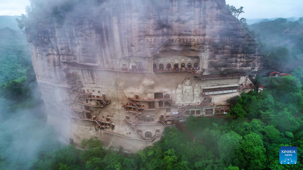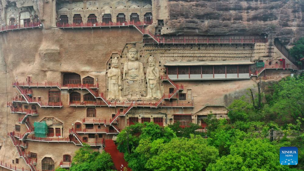 This aerial photo taken on May 31, 2023 shows the Maijishan Grottoes in Tianshui City, northwest China's Gansu Province. About 2,000 years ago, in the Western Han Dynasty (202 B.C.- A.D. 25), a Chinese envoy named Zhang Qian began his expedition to the Western Regions and opened a trade route that later became the Silk Road.