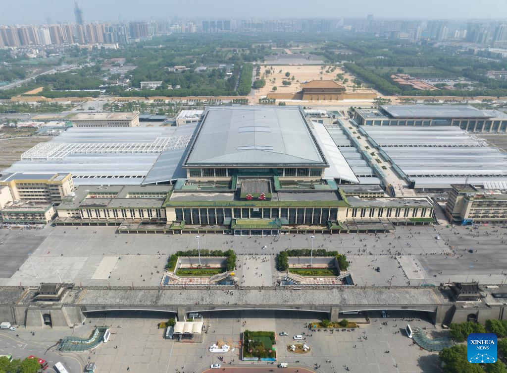 This aerial photo taken on April 25, 2023 shows a view of the Xi'an Railway Station and the Daming Palace National Heritage Park behind it in Xi'an, northwest China's Shaanxi Province. About 2,000 years ago, in the Western Han Dynasty (202 B.C.- A.D. 25), a Chinese envoy named Zhang Qian began his expedition to the Western Regions and opened a trade route that later became the Silk Road.