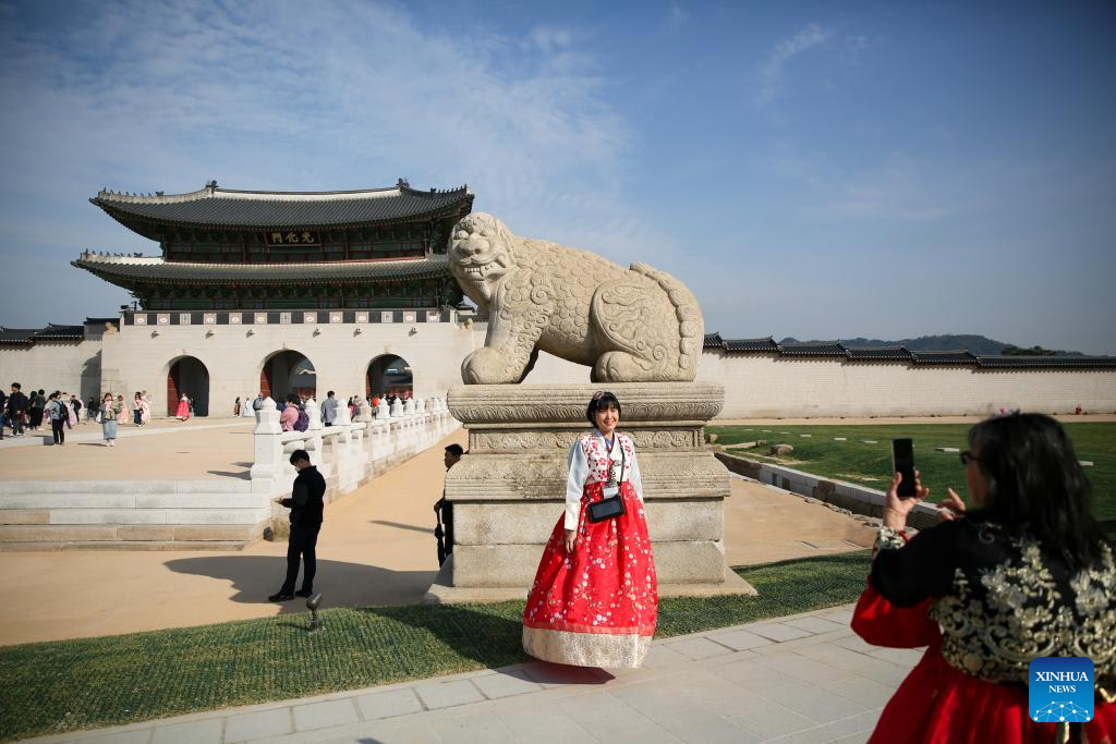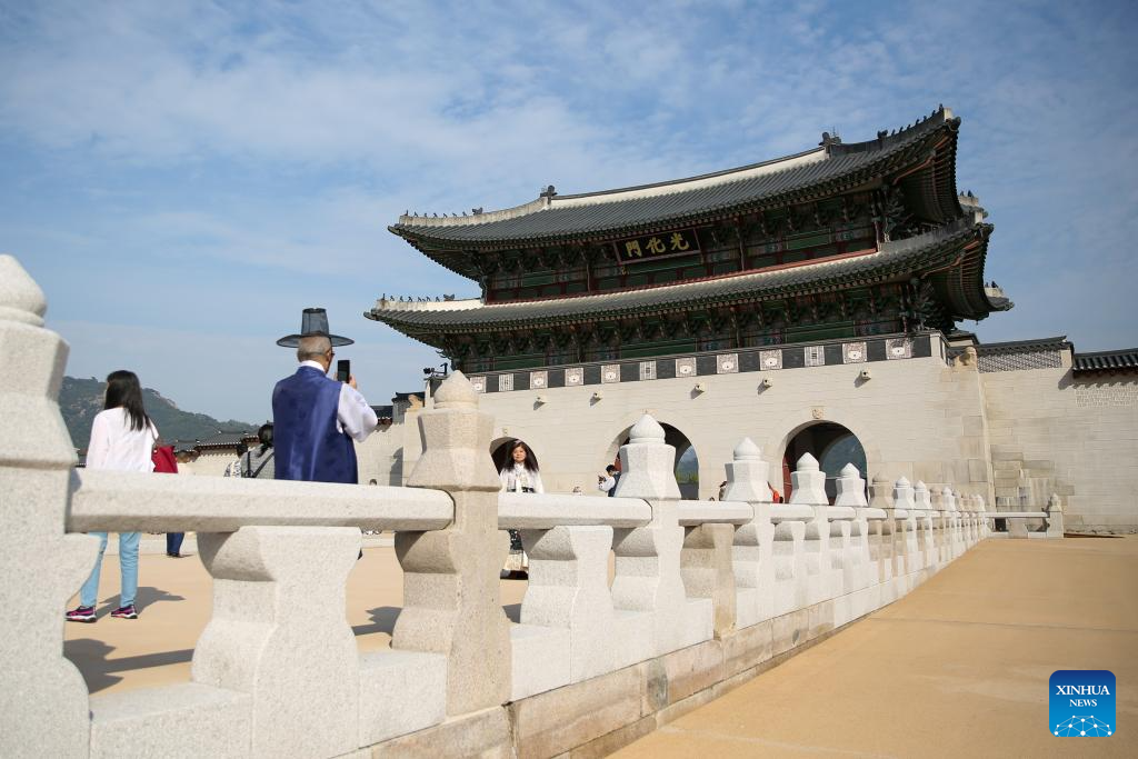 Tourists visit and take photos of Gwanghwamun, the largest gate of Gyeongbokgung Palace in Seoul, South Korea, Oct. 18, 2023. Gyeongbokgung Palace's Gwanghwamun gate has opened to the public after being restored to its original state for the first time. (Xinhua/Wang Yiliang)