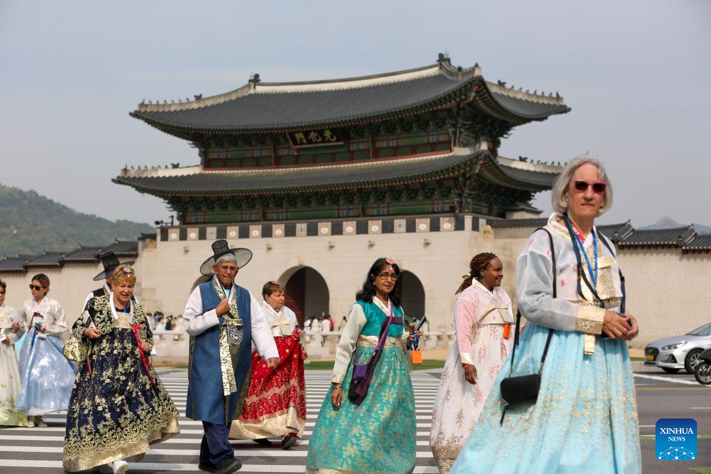Tourists wearing Hanbok cross a street near Gwanghwamun, the largest gate of Gyeongbokgung Palace in Seoul, South Korea, Oct. 18, 2023. Gyeongbokgung Palace's Gwanghwamun gate has opened to the public after being restored to its original state for the first time. (Xinhua/Wang Yiliang)