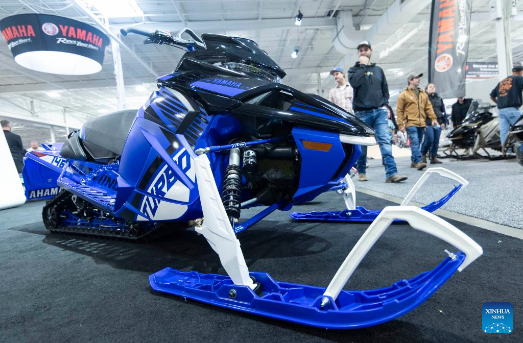 People look at a Yamaha snowmobile during the 2023 Toronto International Snowmobile, ATV & Powersports Show in Mississauga, the Greater Toronto Area, Canada, on Oct. 21, 2023. Showcasing new snowmobile and ATV line-ups from major manufacturers around the world, the annual show is held here from Oct. 20 to 22. (Photo by Zou Zheng/Xinhua)