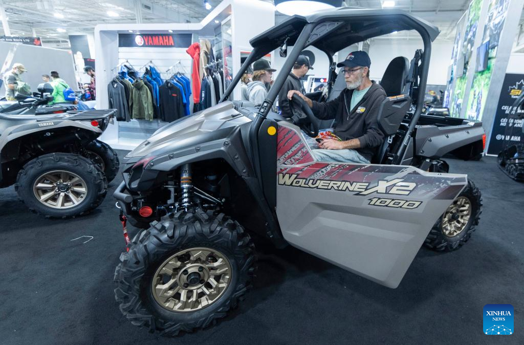 A man experiences a Yamaha all-terrain vehicle (ATV) during the 2023 Toronto International Snowmobile, ATV & Powersports Show in Mississauga, the Greater Toronto Area, Canada, on Oct. 21, 2023. Showcasing new snowmobile and ATV line-ups from major manufacturers around the world, the annual show is held here from Oct. 20 to 22. (Photo by Zou Zheng/Xinhua)