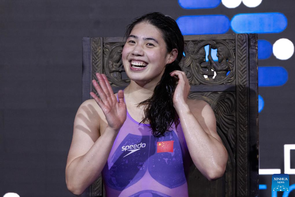 Zhang Yufei of China reacts after winning the women's 100m butterfly final at the World Aquatics Swimming World Cup 2023 in Budapest, Hungary on Oct. 22, 2023. (Photo by Attila Volgyi/Xinhua)