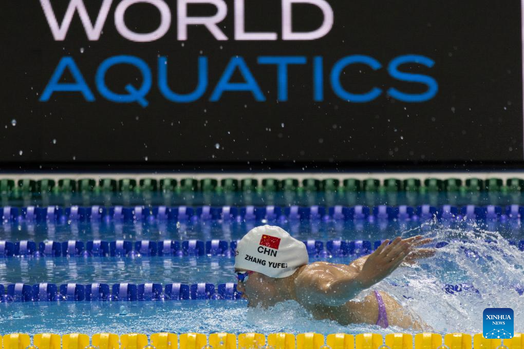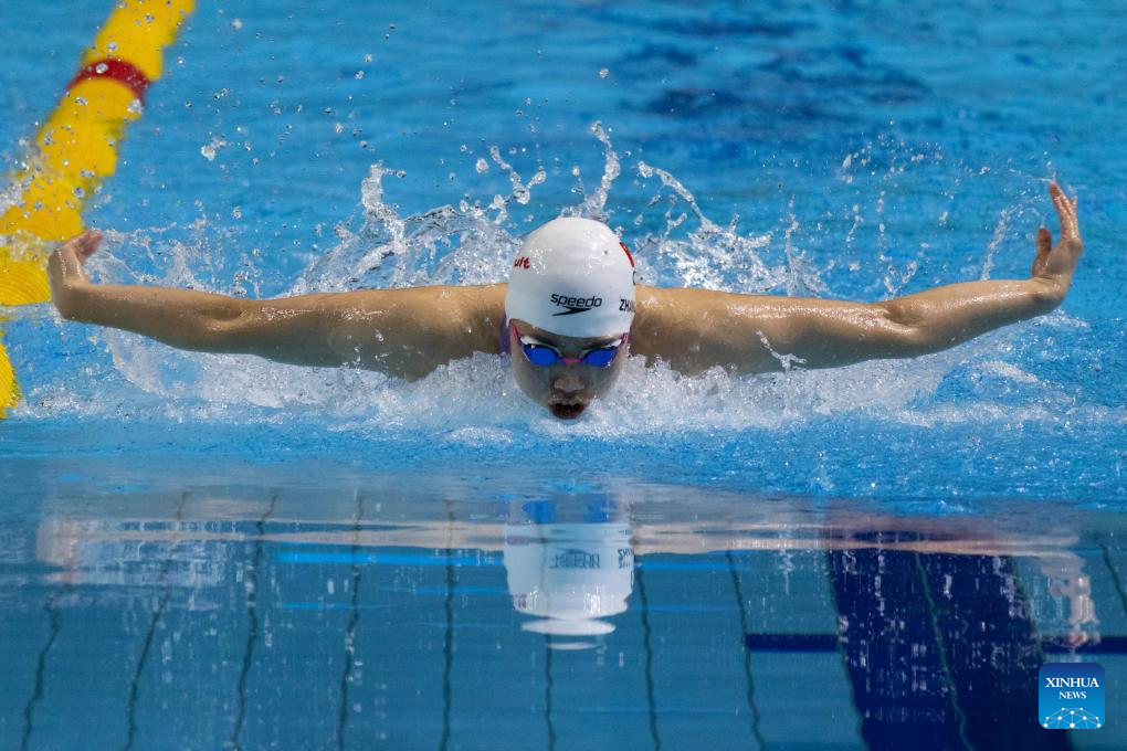 Zhang Yufei of China competes during the women's 100m butterfly final at the World Aquatics Swimming World Cup 2023 in Budapest, Hungary on Oct. 22, 2023. (Photo by Attila Volgyi/Xinhua)
