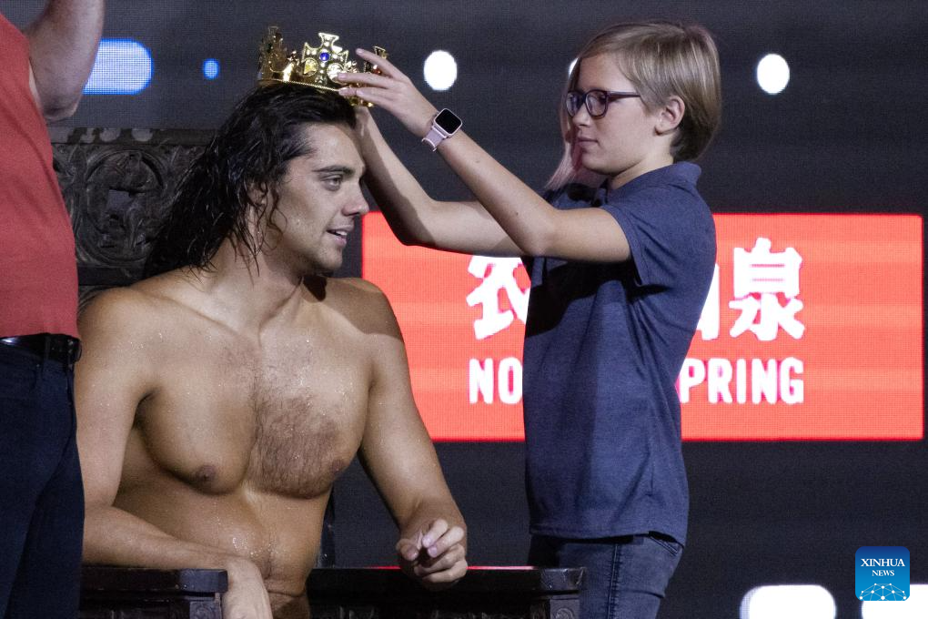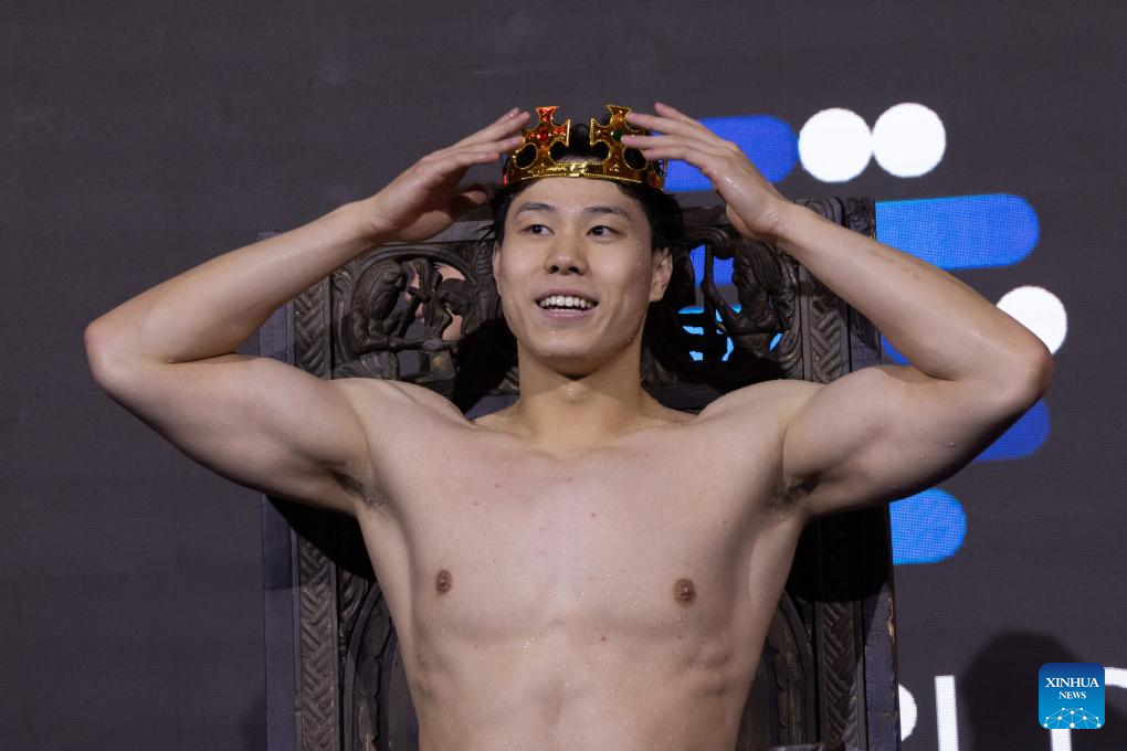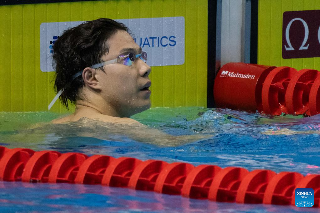 Qin Haiyang of China reacts after winning the men's 200m breaststroke final at the World Aquatics Swimming World Cup 2023 in Budapest, Hungary on Oct. 22, 2023. (Photo by Attila Volgyi/Xinhua)