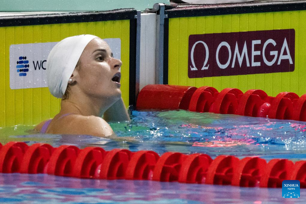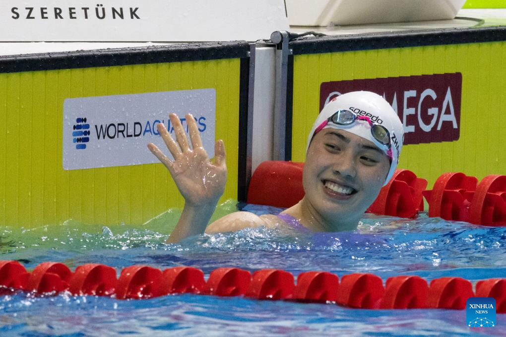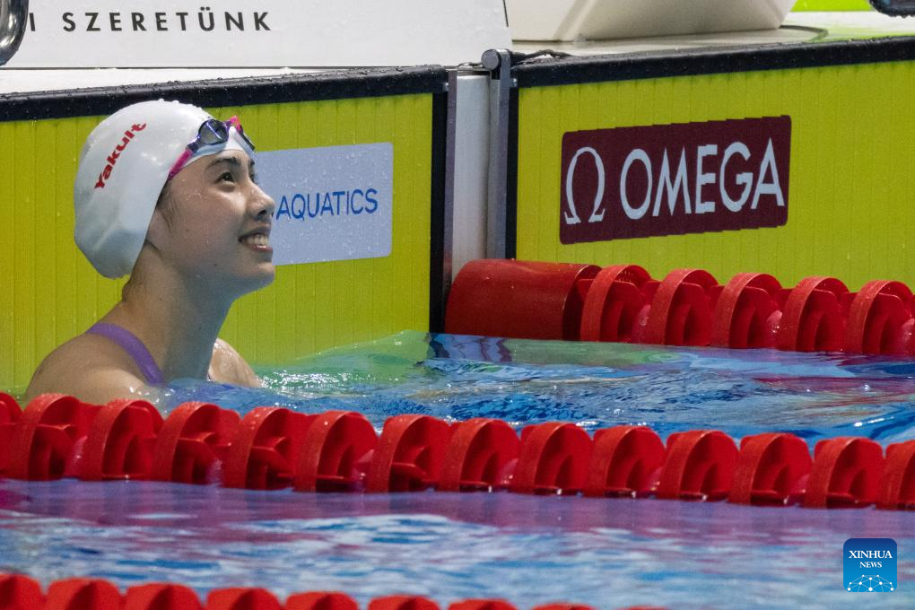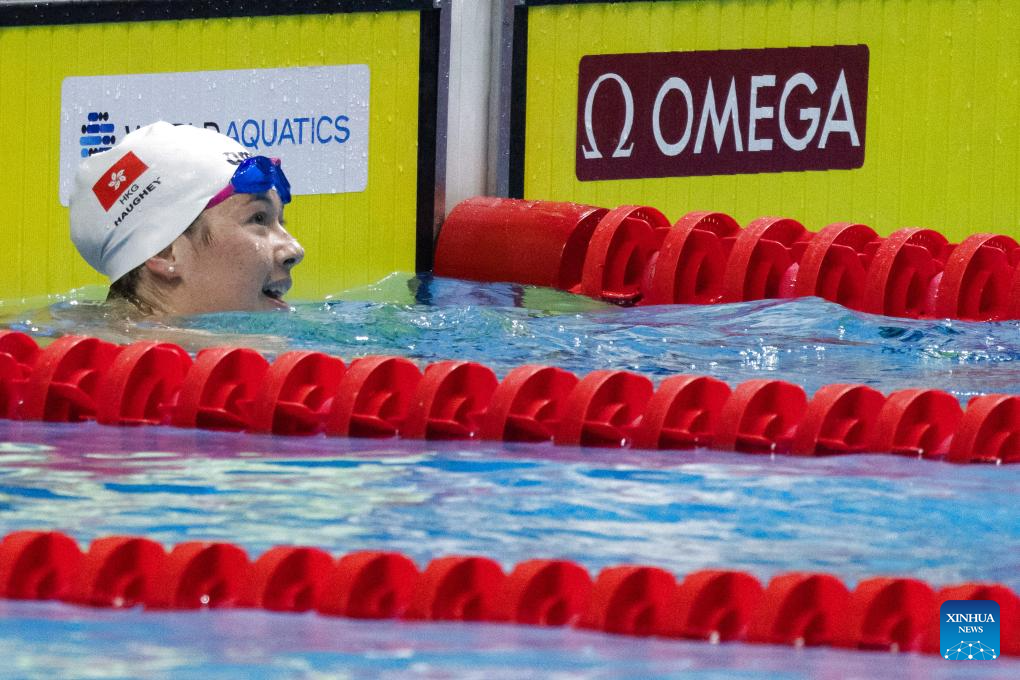 Siobhan Bernadette Haughey of China's Hong Kong reacts after winning the women's 100m freestyle final at the World Aquatics Swimming World Cup 2023 in Budapest, Hungary, on Oct. 22, 2023. (Photo by Attila Volgyi/Xinhua)