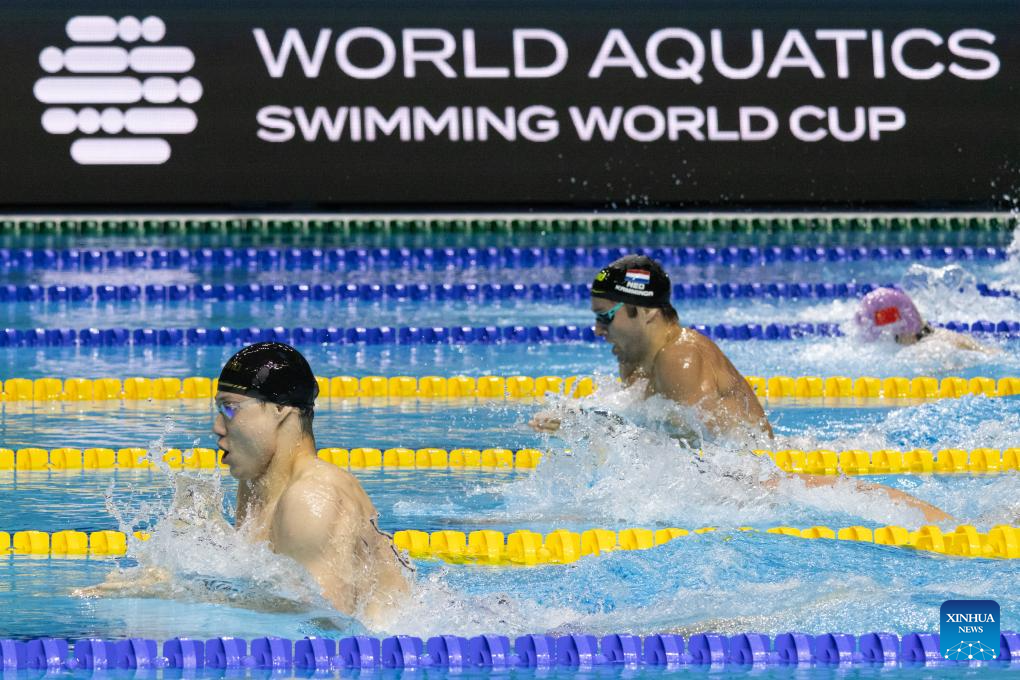 Qin Haiyang (L) of China competes during the men's 200m breaststroke final at the World Aquatics Swimming World Cup 2023 in Budapest, Hungary on Oct. 22, 2023. (Photo by Attila Volgyi/Xinhua)