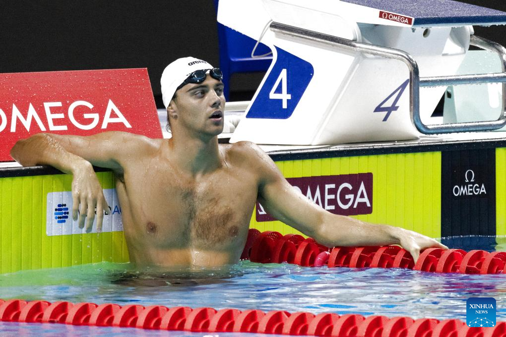 Thomas Ceccon of Italy reacts after winning the men's 100m backstroke final at the World Aquatics Swimming World Cup 2023 in Budapest, Hungary, on Oct. 22, 2023. (Photo by Attila Volgyi/Xinhua)