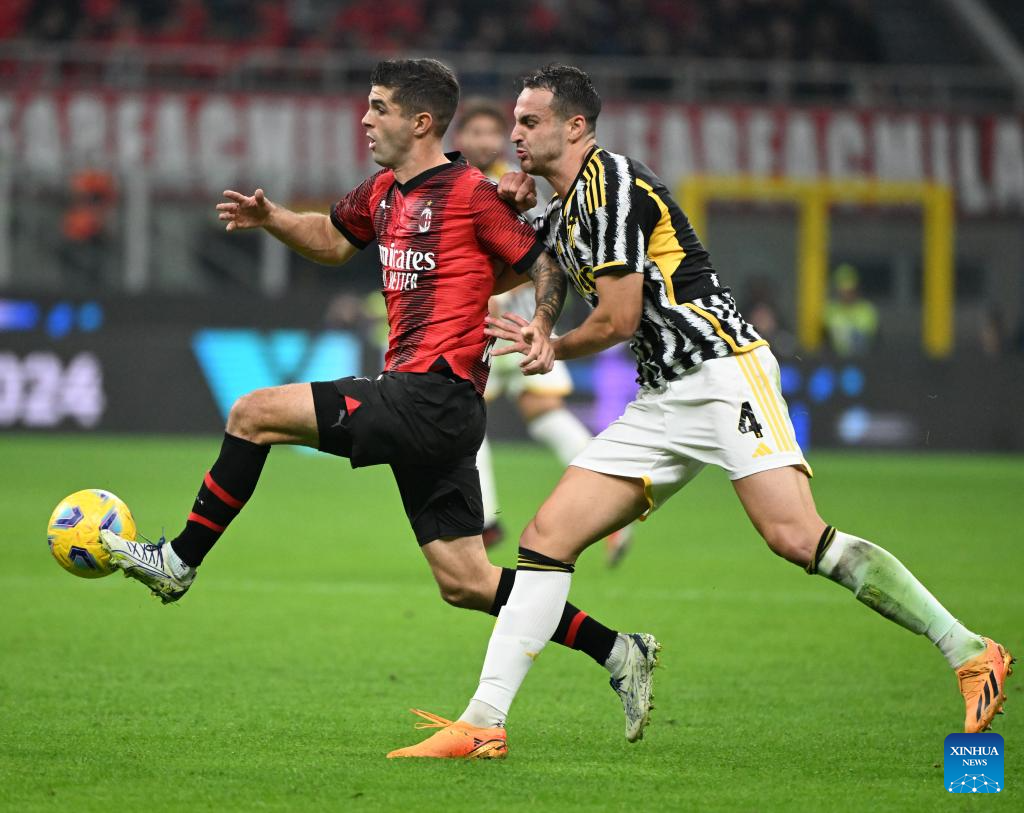 AC Milan's Christian Pulisic (L) vies with FC Juventus' Federico Gatti during a Serie A football match between AC Milan and FC Juventus in Milan, Italy, on Oct. 22, 2023. (Photo by Alberto Lingria/Xinhua)