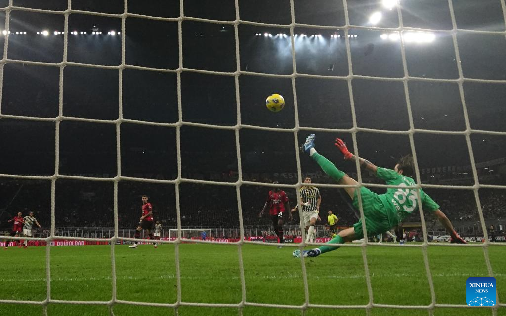 FC Juventus' Manuel Locatelli (2nd L) scores his goal during a Serie A football match between AC Milan and FC Juventus in Milan, Italy, on Oct. 22, 2023. (Photo by Alberto Lingria/Xinhua)