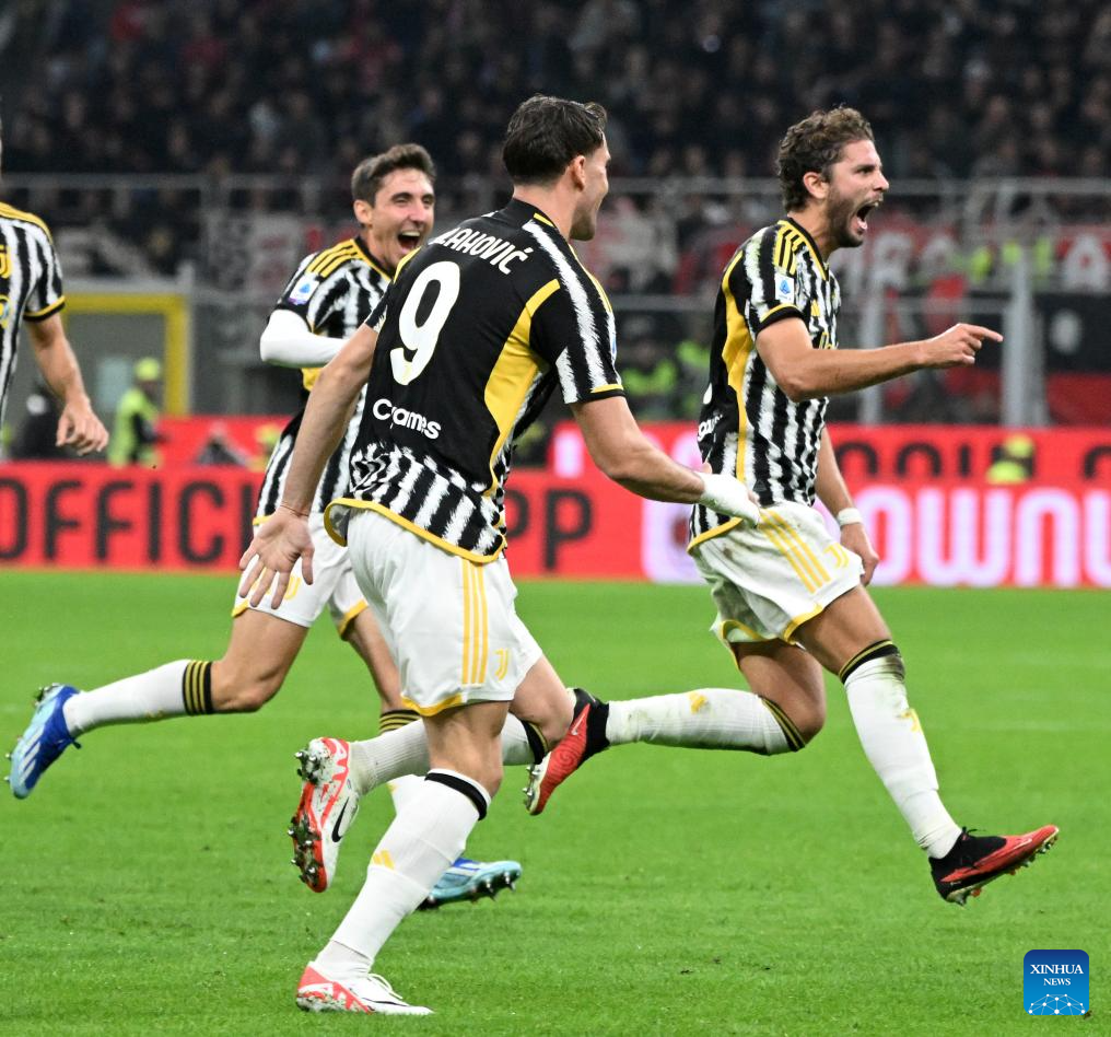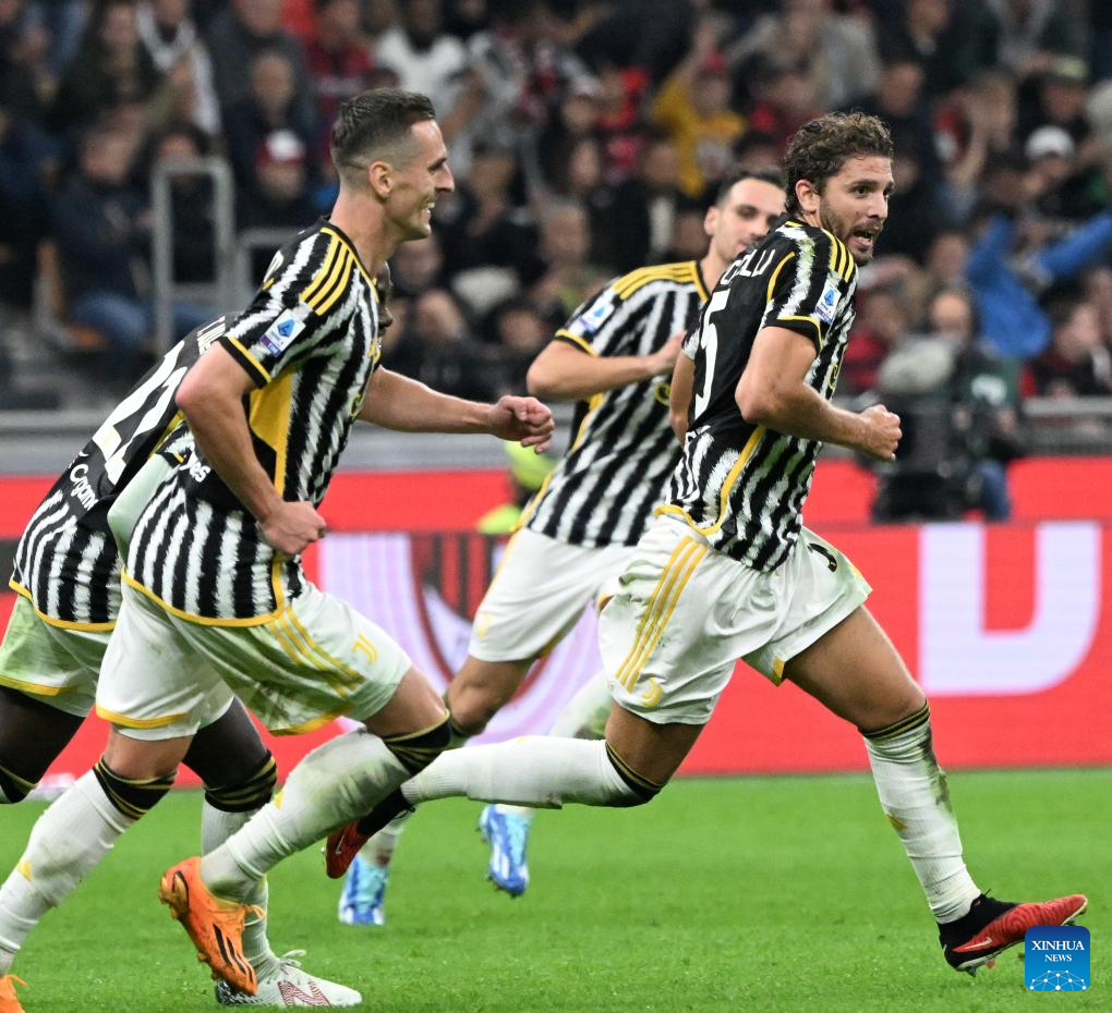 FC Juventus' Manuel Locatelli (R) celebrates his goal during a Serie A football match between AC Milan and FC Juventus in Milan, Italy, on Oct. 22, 2023. (Photo by Alberto Lingria/Xinhua)