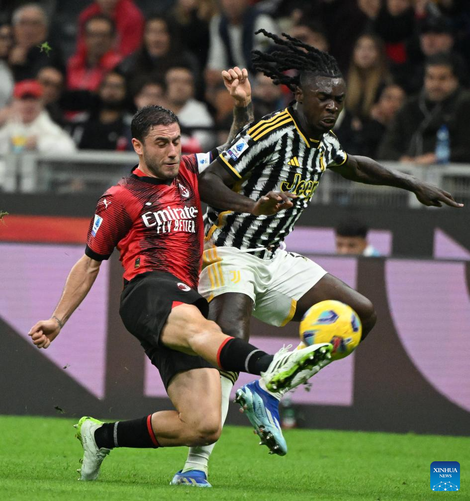 AC Milan's Davide Calabria (L) vies with FC Juventus' Mouse Kean during a Serie A football match between AC Milan and FC Juventus in Milan, Italy, on Oct. 22, 2023. (Photo by Alberto Lingria/Xinhua)