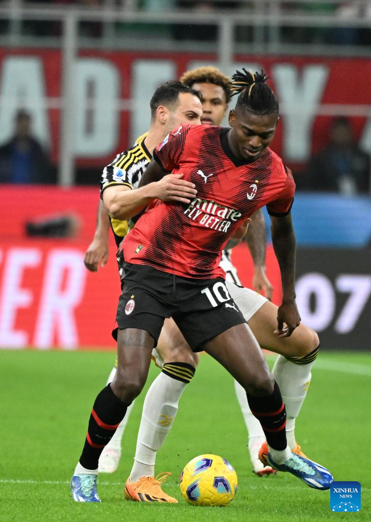 AC Milan's Rafael Leao (R) vies with FC Juventus' Federico Gatti during a Serie A football match between AC Milan and FC Juventus in Milan, Italy, on Oct. 22, 2023. (Photo by Alberto Lingria/Xinhua)