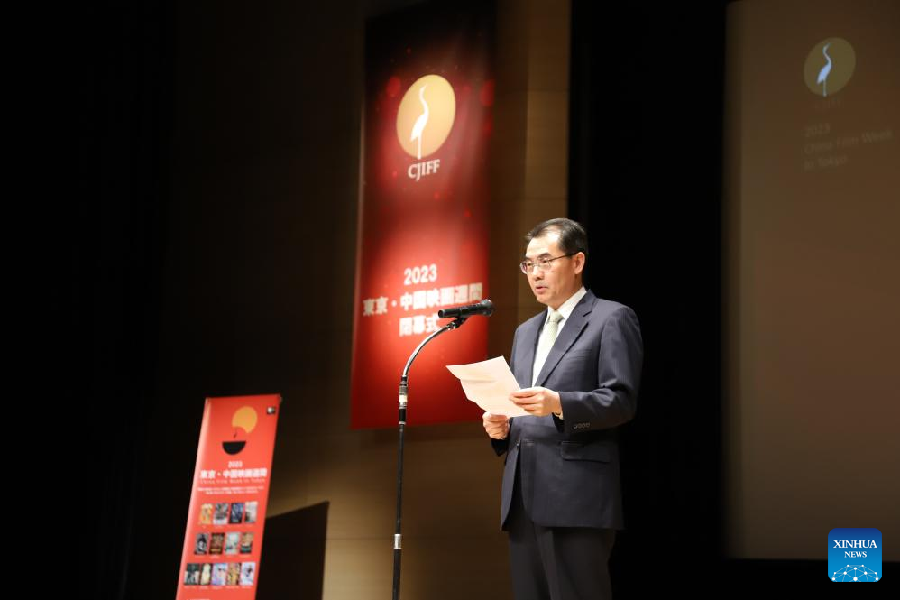 Wu Jianghao, Chinese ambassador to Japan, addresses the closing ceremony of the China Film Week of the 36th Tokyo International Film Festival (TIFF) in Tokyo, Japan, Oct. 24, 2023. The China Film Week of the 36th TIFF has concluded, with the Golden Crane Awards ceremony held in Tokyo on Tuesday. (Xinhua/Ouyang Dina)