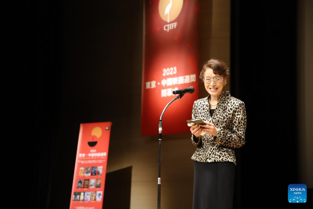 Komaki Kurihara, vice president of the Japan-China Cultural Exchange Association, addresses the closing ceremony of the China Film Week of the 36th Tokyo International Film Festival (TIFF) in Tokyo, Japan, Oct. 24, 2023.