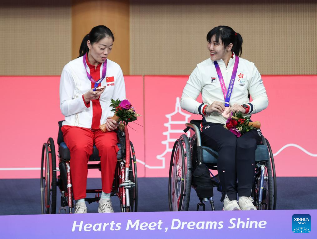Bronze medalists Zou Xufeng (L) of China and Yu Chui Yee of China's Hong Kong talk during the awarding ceremony of the Women's Foil Individual Category A of Wheelchair Fencing at the 4th Asian Para Games in Hangzhou, east China's Zhejiang Province, Oct. 23, 2023. (Xinhua/Hu Xingyu)