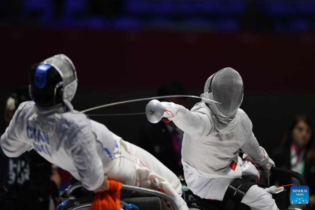 Tian Jianquan (R) of China competes against his compatriot Cheng Yang during the Gold Medal Bout of Men's Sabre Individual Category A of Wheelchair Fencing at the 4th Asian Para Games in Hangzhou, east China's Zhejiang Province, Oct. 23, 2023. (Xinhua/Hu Xingyu)