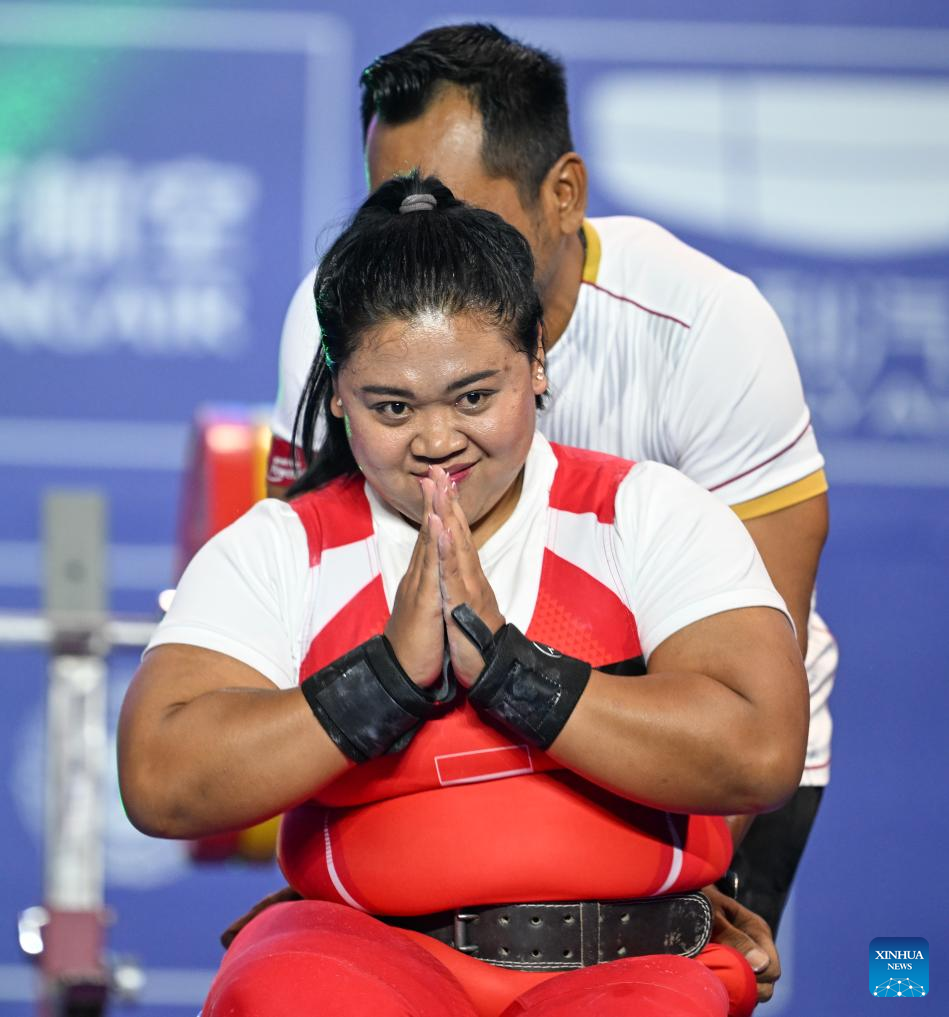 Bronze medalist Siti Mahmudah of Indonesia reacts during the Women's 79kg Final of the Powerlifting at the 4th Asian Para Games in Hangzhou, east China's Zhejiang Province, Oct. 26, 2023. (Xinhua/Bei He)