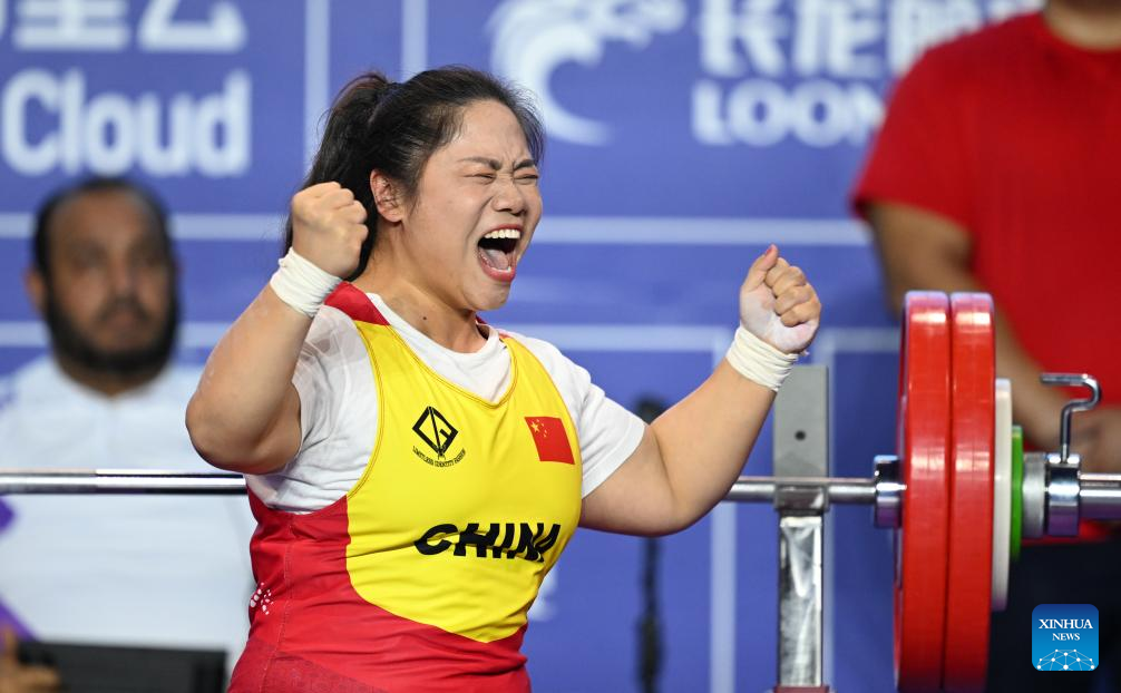 Gold medalist Xu Lili of China celebrates during the Women's 73kg Final of the Powerlifting at the 4th Asian Para Games in Hangzhou, east China's Zhejiang Province, Oct. 26, 2023. (Xinhua/Bei He)