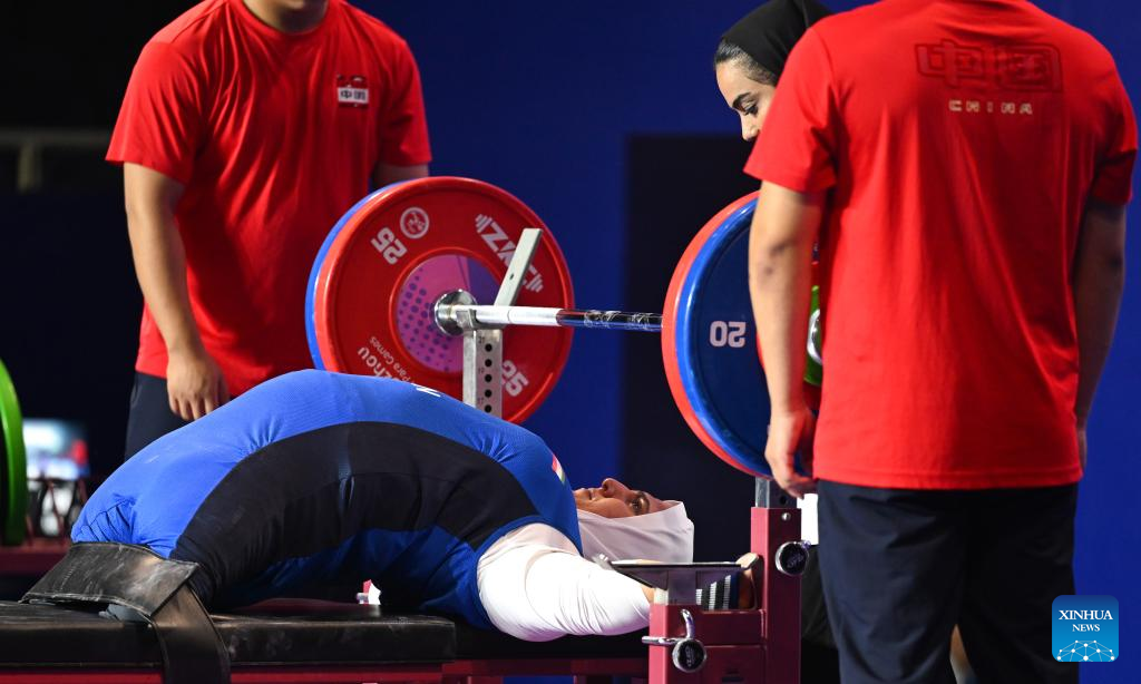 Bronze medalist Zahra Aghaeisamani of Iran competes during the Women's 73kg Final of the Powerlifting at the 4th Asian Para Games in Hangzhou, east China's Zhejiang Province, Oct. 26, 2023. (Xinhua/Bei He)