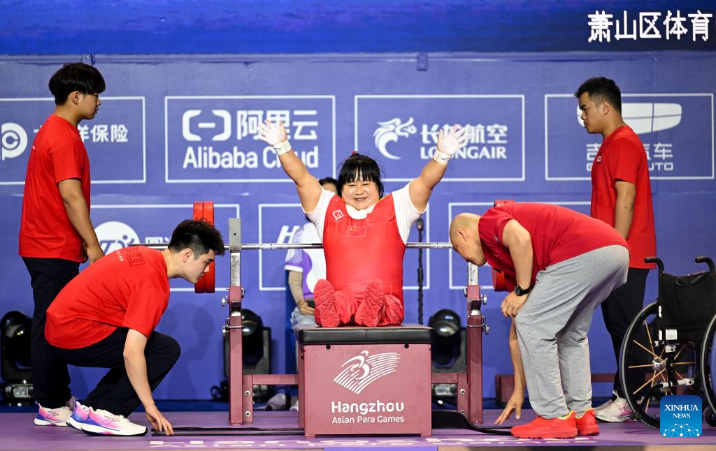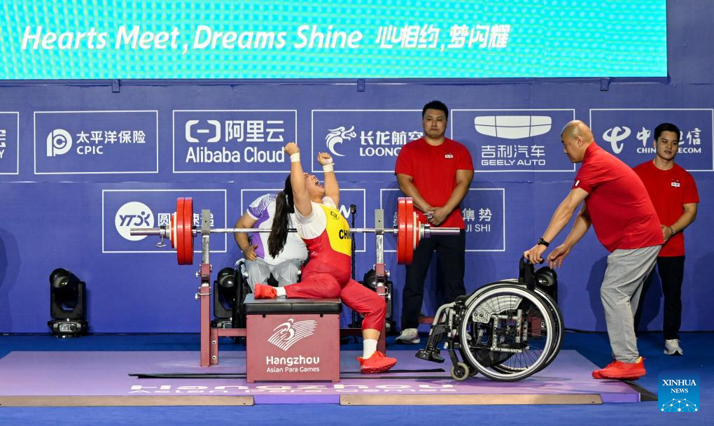 Gold medalist Xu Lili of China competes during the Women's 73kg Final of the Powerlifting at the 4th Asian Para Games in Hangzhou, east China's Zhejiang Province, Oct. 26, 2023. (Xinhua/Bei He)