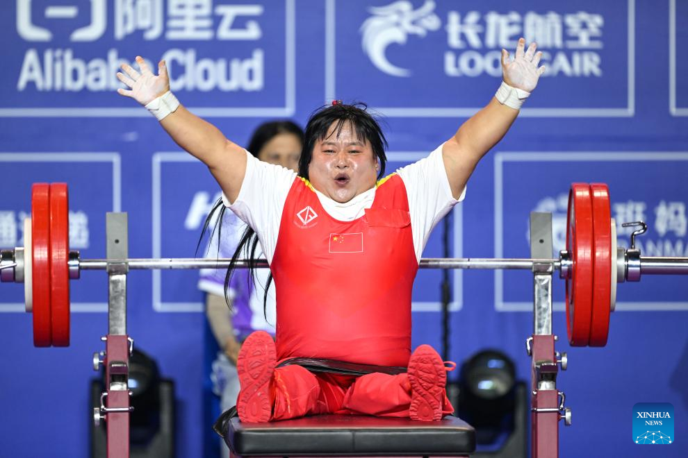 Gold medalist Han Miaoyu of China reacts during the Women's 79kg Final of the Powerlifting at the 4th Asian Para Games in Hangzhou, east China's Zhejiang Province, Oct. 26, 2023. (Xinhua/Bei He)