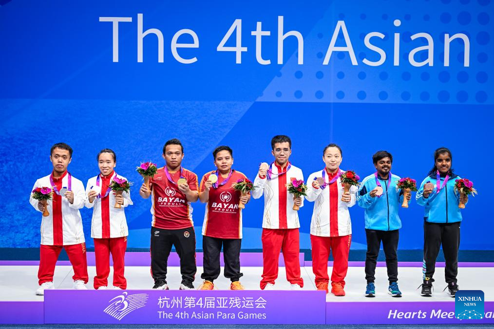 Gold medalists Rina Marlina (4th L)/Subhan(3rd L) of Indonesia, silver medalists Zeng Qingtao (1st L)/Lin Shuangbao (2nd L) of China, bronze medalists Lin Naili (4th R)/Li Fengmei (3rd R) of China and Sivan Nithya Sre Sumathy/Sivarajan Solaimalai (2nd R) of India pose during the awarding ceremony of Mixed Doubles SH6 event of Badminton at the 4th Asian Para Games in Hangzhou, east China's Zhejiang Province, Oct. 26, 2023. (Xinhua/Wu Zhizun)