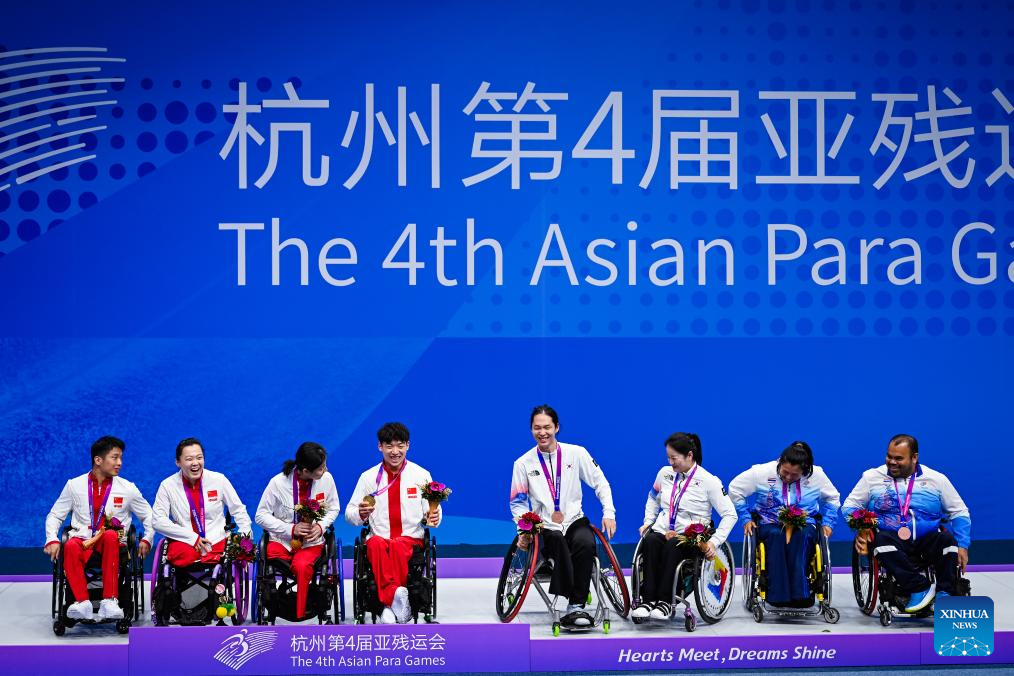 Gold medalists Qu Zimo(4th L)/Liu Yutong(3rd L) of China, silver medalists Yang Tong(1st L)/Li Hongyan(2nd L) of China, bronze medalists Yu Sooyoung(4th R)/Kwon Hyunah(3rd R) of South Korea and Amnouy Wetwithan/Jakarin Homhual (1st R) of Thailand pose during the awarding ceremony of Mixed Doubles WH1-WH2 event of Badminton at the 4th Asian Para Games in Hangzhou, east China's Zhejiang Province, Oct. 26, 2023. (Xinhua/Wu Zhizun)