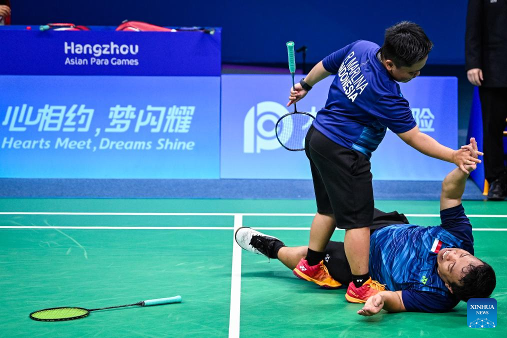 Rina Marlina/Subhan(L) of Indonesia react during the Mixed Doubles SH6 final of Badminton against Zeng Qingtao/Lin Shuangbao of China at the 4th Asian Para Games in Hangzhou, east China's Zhejiang Province, Oct. 26, 2023. (Xinhua/Wu Zhizun)