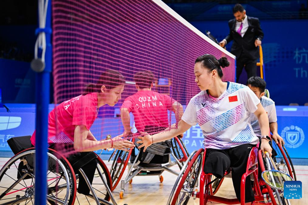 Yang Tong(L)/Li Hongyan of China compete during the Mixed Doubles WH1-WH2 final of Badminton against their compatriots Liu Yutong/Qu Zimo at the 4th Asian Para Games in Hangzhou, east China's Zhejiang Province, Oct. 26, 2023. (Xinhua/Wu Zhizun)