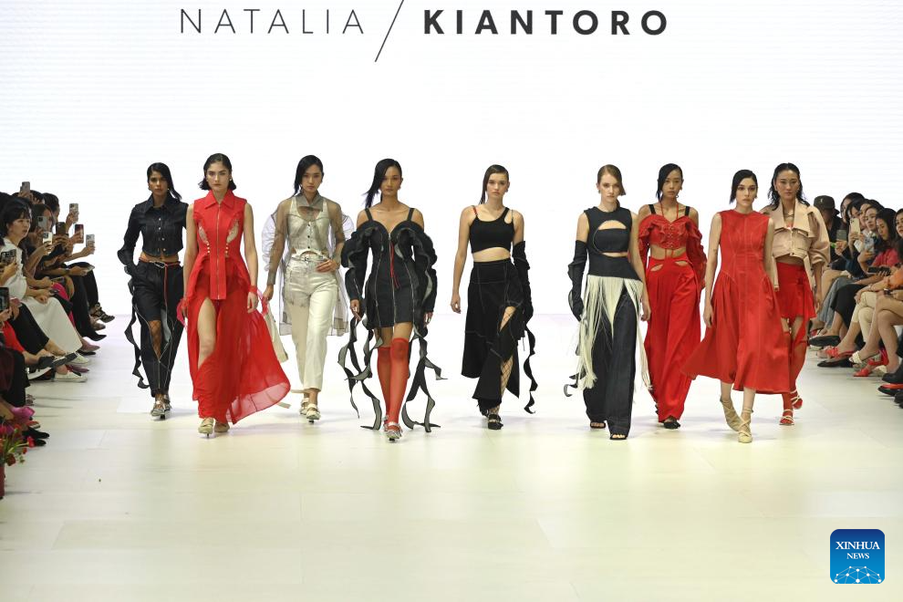 Models present creations during Jakarta Fashion Week 2024 in Jakarta, Indonesia, Oct. 29, 2023. (Xinhua/Agung Kuncahya B.)