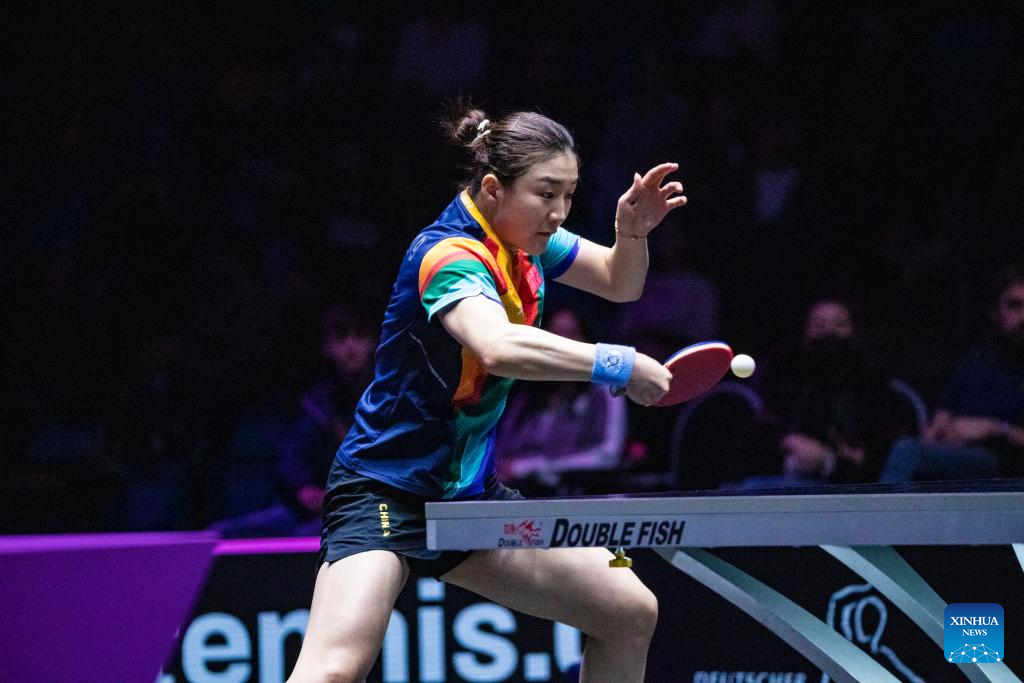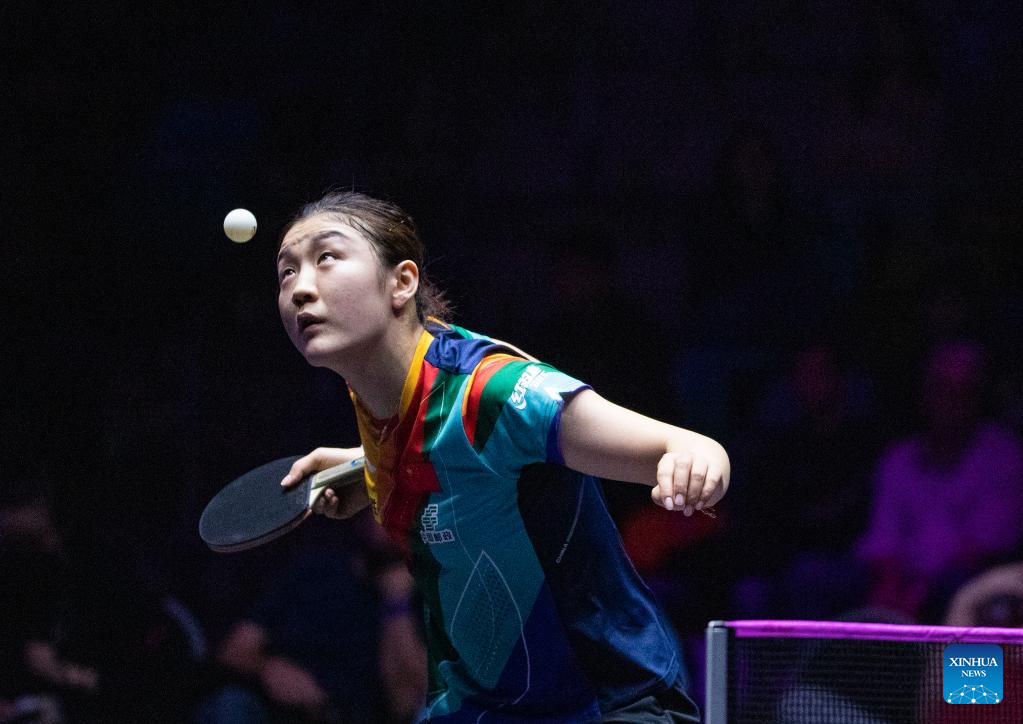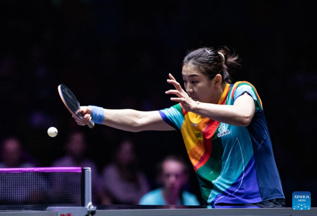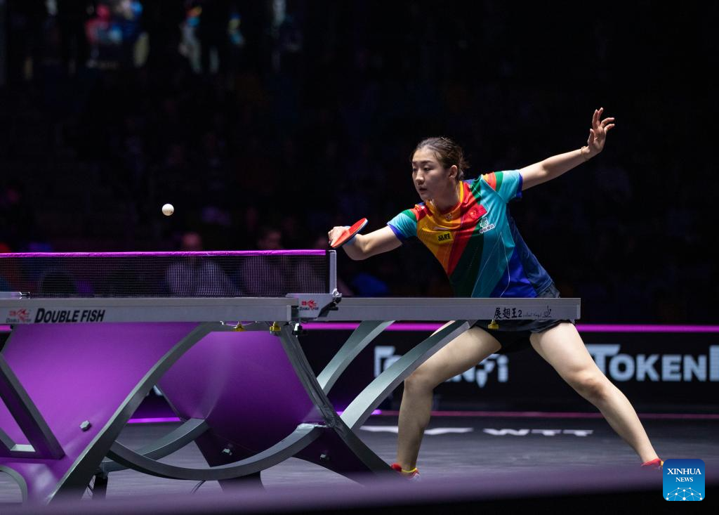 Chen Meng of China hits a return during the women's singles round of 32 match against Suthasini Sawettabut of Thailand at the WTT Champions Frankfurt 2023 in Frankfurt, Germany, Oct. 29, 2023. (Xinhua/Zhang Fan)