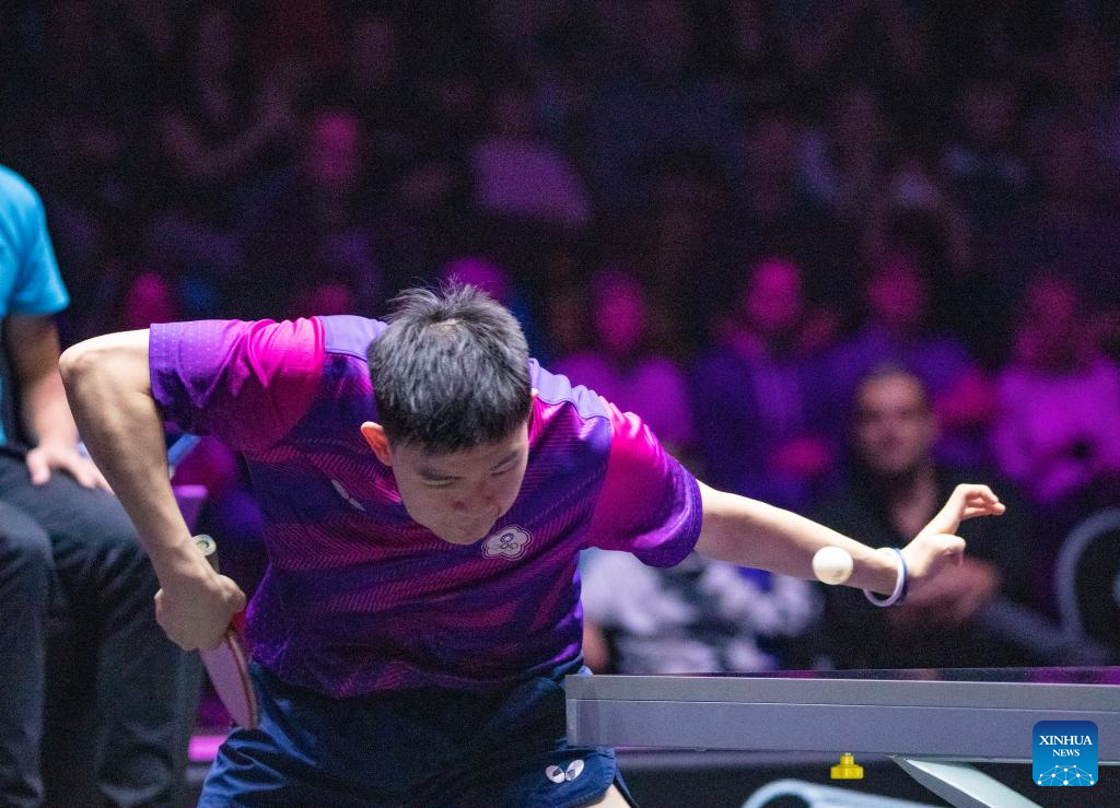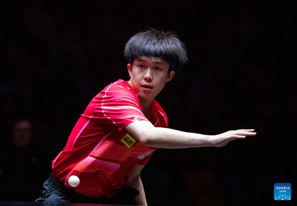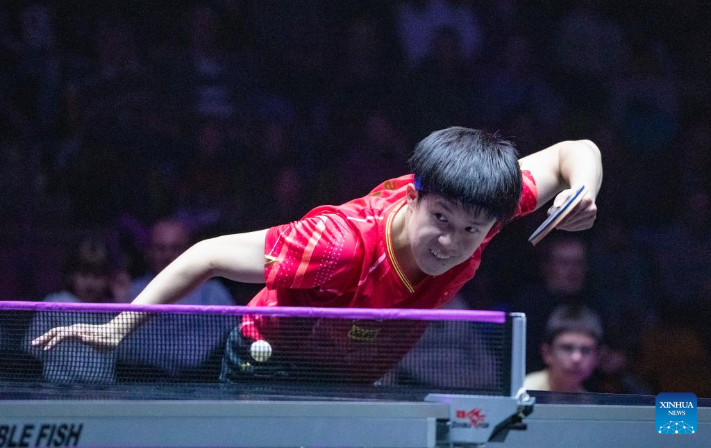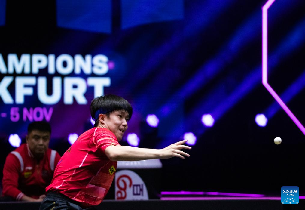 Wang Chuqin of China hits a return during the men's singles round of 32 match against Kao Cheng-Jui of Chinese Taipei at the WTT Champions Frankfurt 2023 in Frankfurt, Germany, Oct. 29, 2023. (Xinhua/Zhang Fan)