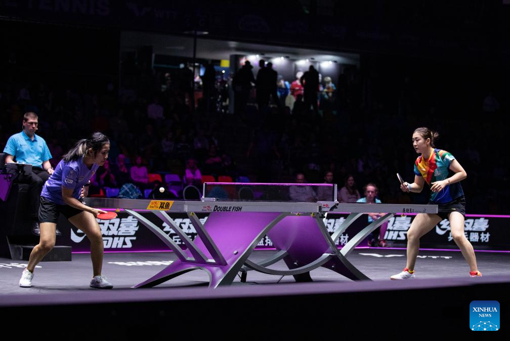 Suthasini Sawettabut (L) of Thailand hits a return during the women's singles round of 32 match against Chen Meng of China at the WTT Champions Frankfurt 2023 in Frankfurt, Germany, Oct. 29, 2023. (Xinhua/Zhang Fan)